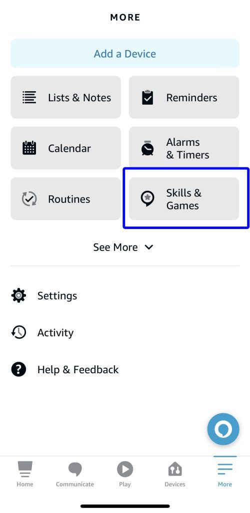 1. Open the Amazon Alexa App, open the “More” menu at the bottom-right corner of the screen, and then press “Alexa Skills”