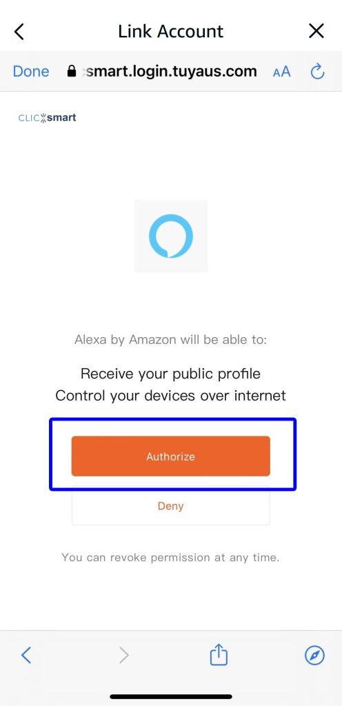 4. Follow the login flow to complete the link between ClicSmart and Alexa. Enter your ClicSmart username and password when prompted. When finished, tap the “Authorize” button.